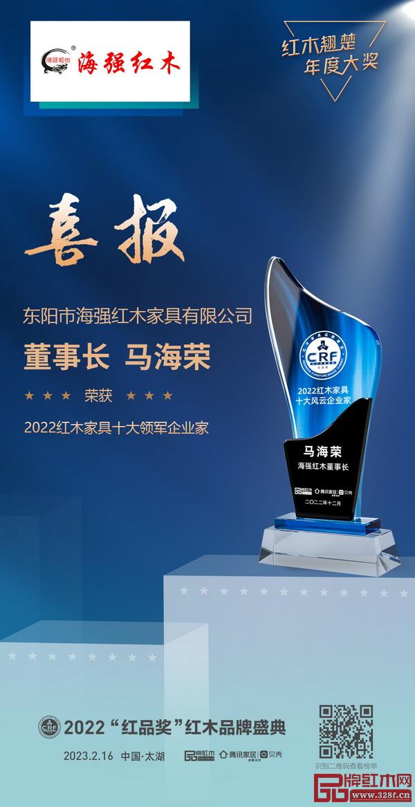 “他懷抱雄心、格局遠(yuǎn)大,幾十載深耕不輟,在整裝領(lǐng)域奮勇爭先;他百折不撓、雷厲風(fēng)行,穩(wěn)抓品質(zhì)核心,率領(lǐng)企業(yè)居領(lǐng)先地位,成為行業(yè)榜樣力量?!边@是紅木品牌盛典組委會(huì)給予海強(qiáng)紅木董事長馬海榮的高度評價(jià)。