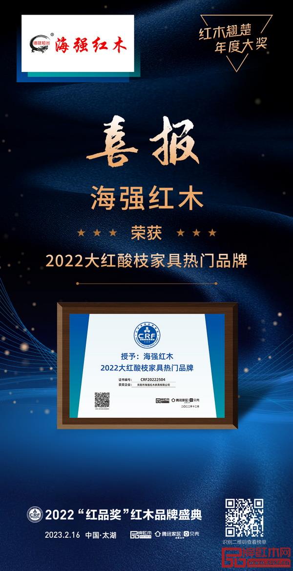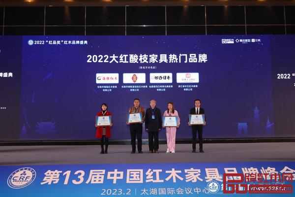 海強(qiáng)紅木榮獲“2022大紅酸枝家具熱門品牌”上臺(tái)領(lǐng)獎(jiǎng)(左一)