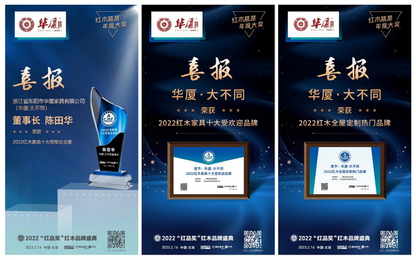 在眾多領(lǐng)導(dǎo)、專家、行業(yè)精英的見證下,各大榜單強(qiáng)勢揭秘,華廈·大不同憑借實(shí)力交出一份滿意的成績,四度蟬聯(lián)“紅木家具十大受歡迎品牌”,摘得“2022紅木全屋定制熱門品牌”獎(jiǎng)項(xiàng),華廈·大不同董事長陳田華斬獲“2022紅木家具十大領(lǐng)軍企業(yè)家”榮譽(yù)稱號,彰顯出不凡的品牌力量。
