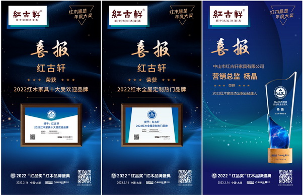 在同期高規(guī)格舉行的2022“紅品獎(jiǎng)”紅木品牌盛典上,紅古軒接連斬獲四項(xiàng)大獎(jiǎng):品牌連續(xù)13年榮獲“紅木家具十大受歡迎品牌”;全力打造的紅木高端整裝,加冕“2022紅木全屋定制熱門品牌”;作為紅古軒品牌的策劃者,營(yíng)銷總監(jiān)楊晶連續(xù)11年榮獲“紅木家具杰出職業(yè)經(jīng)理人”;連續(xù)14年舉辦“‘紅古軒杯’新中式家具設(shè)計(jì)大賽”,獲評(píng)“2022紅木家具企業(yè)十大新聞事件”。數(shù)獎(jiǎng)齊發(fā),榮耀滿載,綻放非凡品牌實(shí)力。