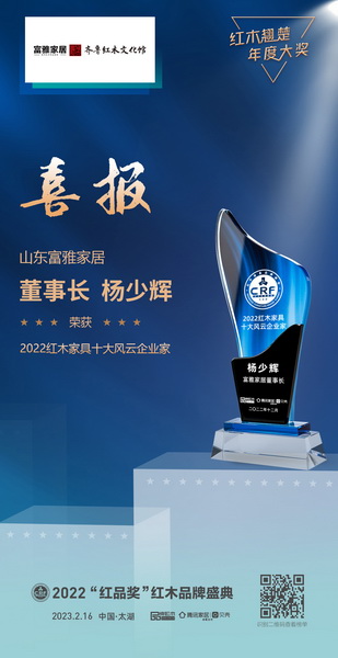 [摘要]在2022“紅品獎”紅木品牌盛典上,富雅家居再次不負眾望,榮獲品牌及人物雙料大獎:富雅家居榮獲“2022特具影響力紅木家具專業(yè)市場”,至此已是十度榮獲該獎項,成為首屈一指的高端紅木家具市場;楊少輝董事長再次捧起“2022紅木家具十大風(fēng)云企業(yè)家”的獎杯,至此也是連續(xù)2年蟬聯(lián)。