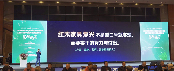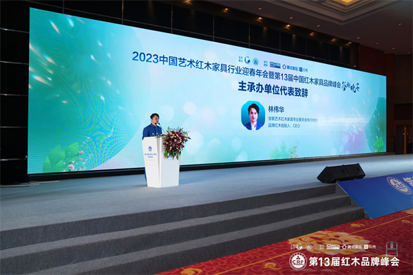 晚宴上,主承辦單位代表——全聯(lián)藝術(shù)紅木家具專業(yè)委員會執(zhí)行會長,品牌紅木創(chuàng)始人、CEO林偉華做了答謝致辭和主題分享,在分享中他從政策面、用戶面、企業(yè)面分析了2023中國紅木家具產(chǎn)業(yè)局勢,并分析了品牌化及數(shù)字化對紅木企業(yè)高質(zhì)量發(fā)展的重要性,以及展望了品牌紅木2023奮進之路。