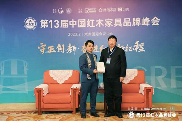 中共第十八屆中央委員、全國政協(xié)文化文史與學(xué)習(xí)委員會副主任葉小文(右)向優(yōu)秀紅木行業(yè)先鋒代表——全聯(lián)藝術(shù)紅木家具專業(yè)委員會執(zhí)行會長、品牌紅木創(chuàng)始人、CEO林偉華贈送個人著作