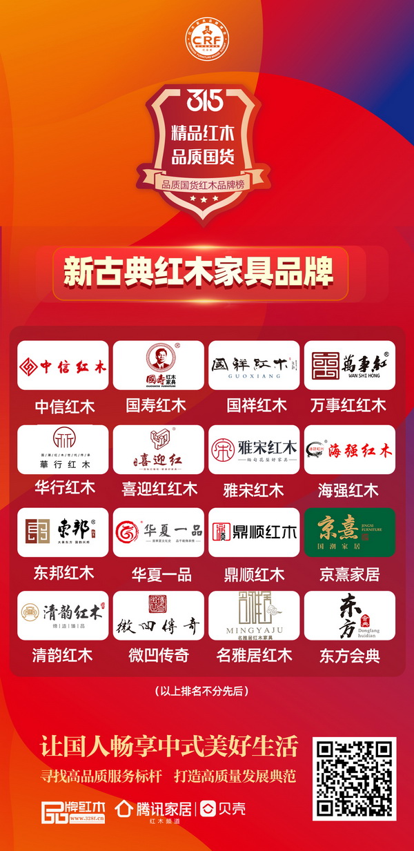 品牌紅木&騰訊家居|貝殼聯(lián)合特別策劃《315品質(zhì)國貨紅木品牌榜》,覆蓋5+品類,超過30+優(yōu)選品牌,旨在尋找高品質(zhì)服務(wù)標(biāo)桿,打造高質(zhì)量發(fā)展典范。打造精品紅木,做高品質(zhì)國貨,讓國人暢享中式美好生活!以下為315品質(zhì)國貨紅木品牌榜—新古典紅木家具品牌。
