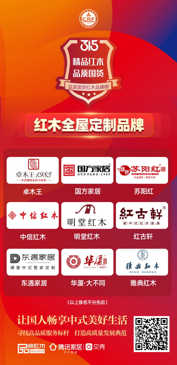 品牌紅木&騰訊家居|貝殼聯(lián)合特別策劃《315品質(zhì)國貨紅木品牌榜》,覆蓋5+品類,超過30+優(yōu)選品牌,旨在尋找高品質(zhì)服務(wù)標(biāo)桿,打造高質(zhì)量發(fā)展典范。打造精品紅木,做高品質(zhì)國貨,讓國人暢享中式美好生活!以下為315品質(zhì)國貨紅木品牌榜—紅木全屋定制品牌。