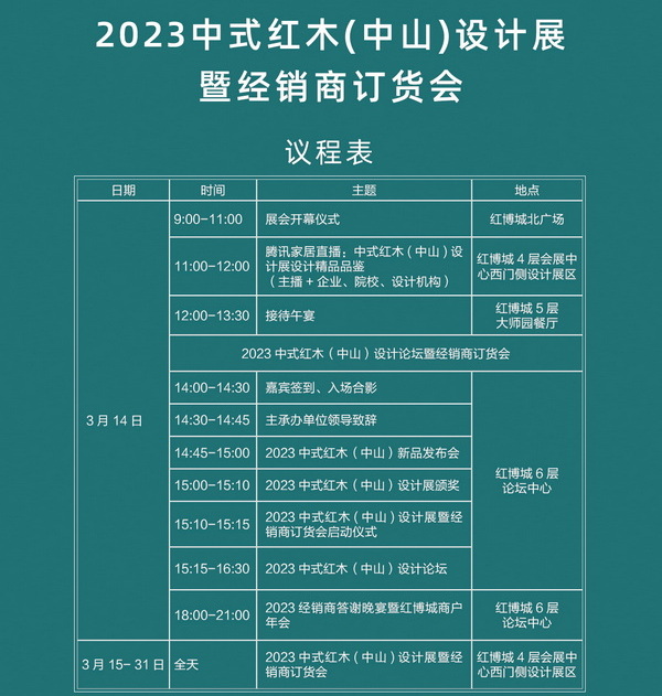 [摘要]3月14日,2023中式紅木(中山)設(shè)計(jì)展暨經(jīng)銷商訂貨會將在廣東中山·大涌紅博城精彩開幕!怎樣將豐富議程一網(wǎng)打盡?