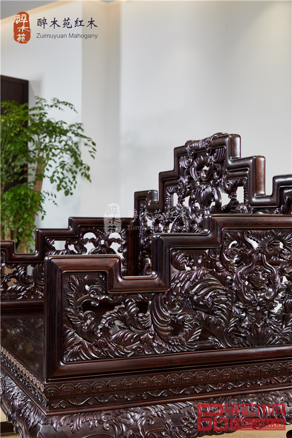 有的人問我,好像每件宮廷家具都有雕花,有雕花就是宮廷家具嗎?其實(shí)不是僅靠雕花去判斷這么簡單,而是看氣勢(shì)。氣勢(shì),始終貫穿在每件宮廷家具上,像醉木苑這款《紫檀卷草紋寶座》大料非常難找,這么大的紫檀原料非常珍貴。