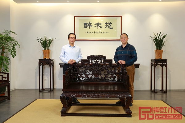 醉木苑總經(jīng)理鄭庭華(右)與蔣念慈(左)在《紫檀卷草紋寶座》處合影留念