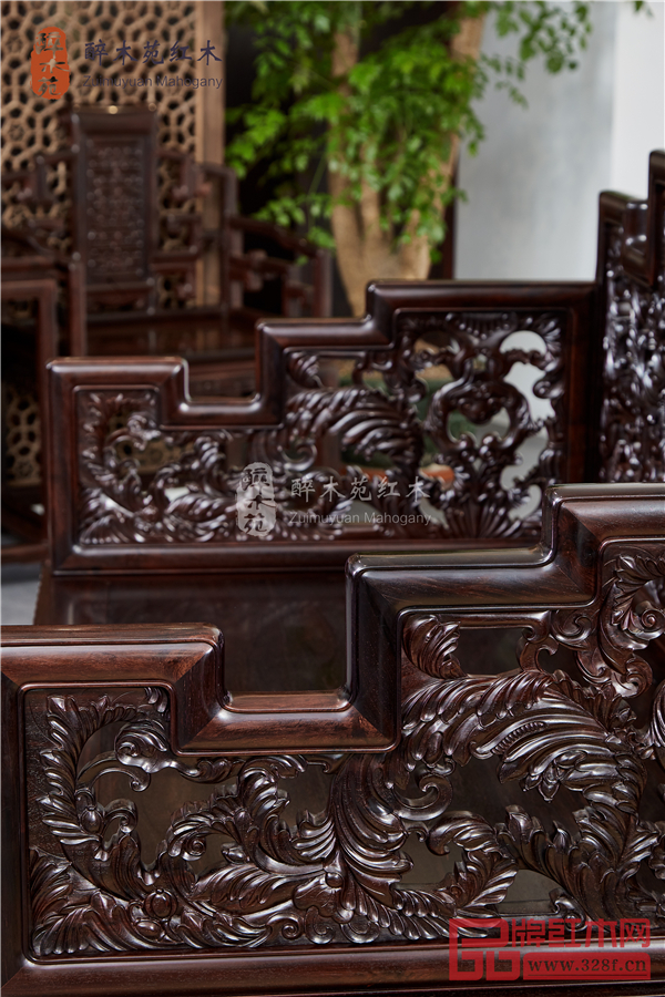 醉木苑《紫檀卷草紋寶座》,是復(fù)刻清中期寶座的典型代表。此寶座精致的雕刻裝飾,是清代融合中西方藝術(shù)風(fēng)格和設(shè)計(jì)特色的成功范例。
