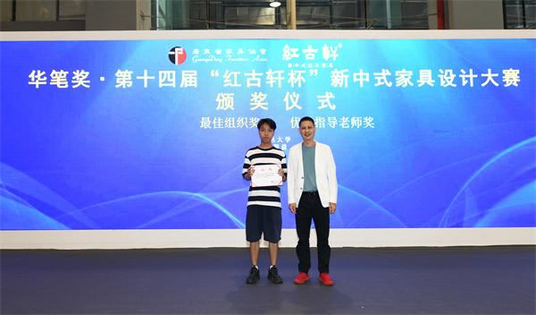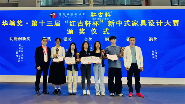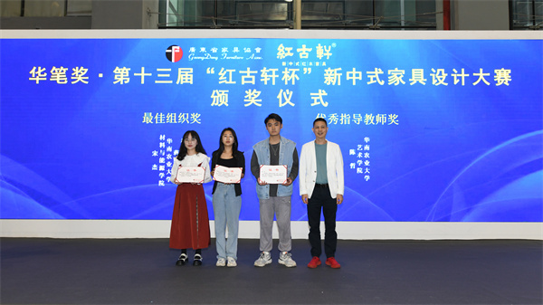 頒獎典禮上,2021年第十三屆紅古軒杯新中式家具設(shè)計大賽,祝靜潔、梁同周、夏侯瑩、李治儒作品《宋韻·書香》奪金獎,獎金30000元;林如旺作品《錦上》,邱曉玲作品《雅序》,將銀獎收入囊中,獎金各10000元;王其文作品《疏影慢》,余香怡、王嘉欣、馬雅作品《觀山》,陳展邦作品《簾境》,贏得銅獎,獎金各5000元;陳延泰、豪乘鶴、孟懌瀅作品《清暉.尋隱》摘得功能創(chuàng)新獎,獎金10000元;華南農(nóng)業(yè)大學(xué)藝術(shù)學(xué)院陳哲老師摘得最佳優(yōu)秀指導(dǎo)老師獎;福建農(nóng)林大學(xué)、華南農(nóng)業(yè)大學(xué)材料與能源學(xué)院摘得最佳組織獎殊榮。