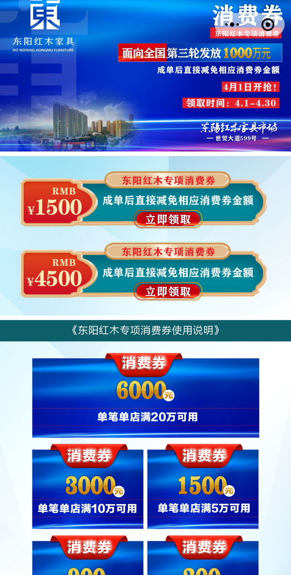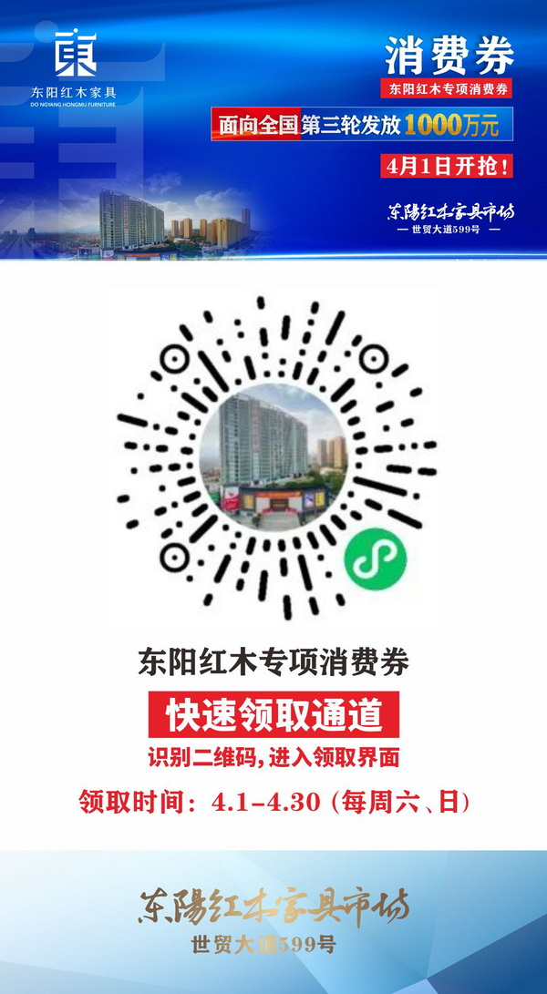 為激活紅木家具消費(fèi)市場(chǎng),提振顧客消費(fèi)信心,助力紅木產(chǎn)業(yè)復(fù)興,東陽(yáng)紅木家具市場(chǎng)將于4月1日起,面向全國(guó)消費(fèi)者發(fā)放價(jià)值1000萬(wàn)元的第三輪紅木家具消費(fèi)券。