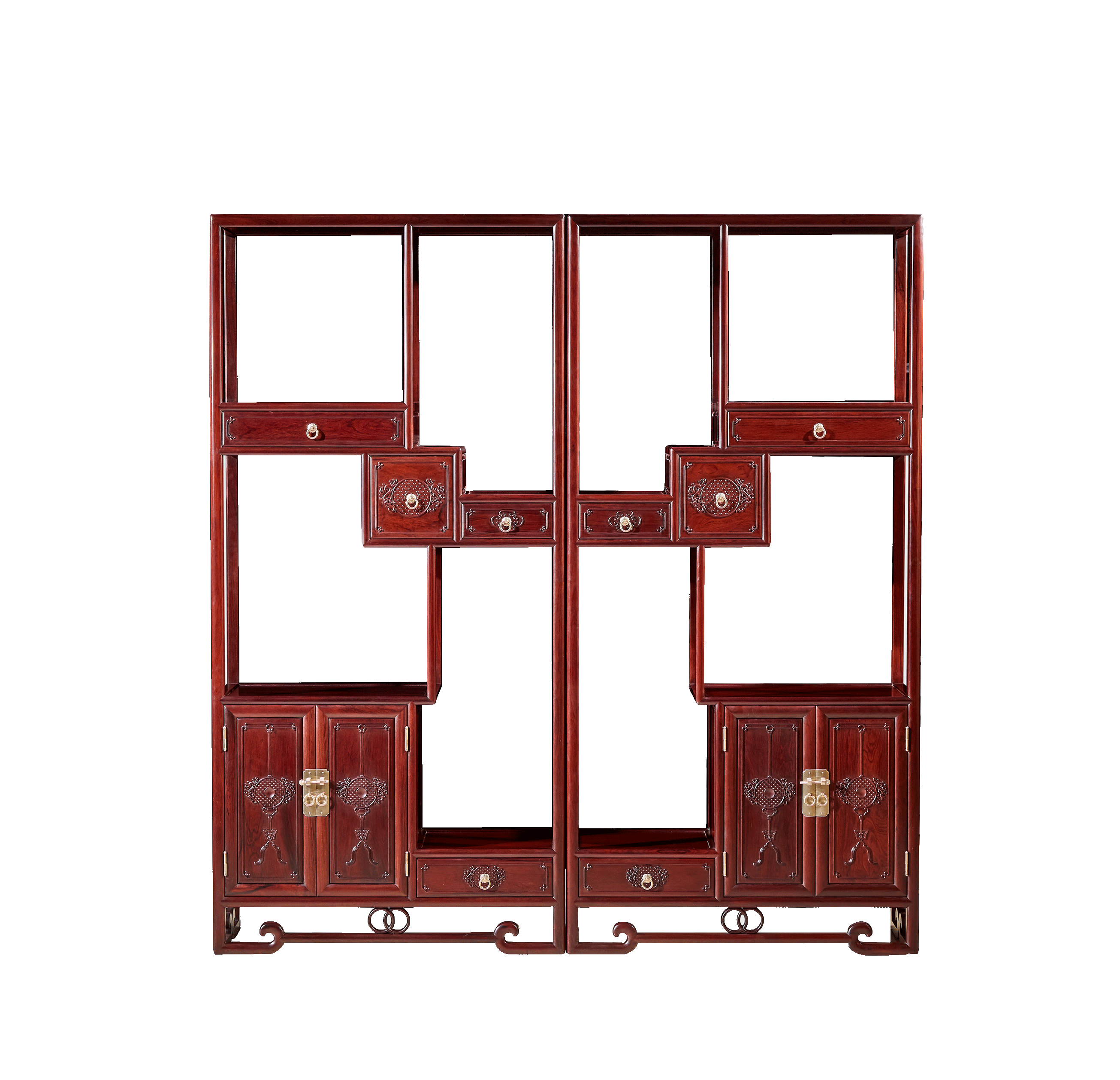 一品居《四抽兩門如意博古架》每個格子形成大小不一,產(chǎn)生豐富的層次感,錯落有致,虛實相生。