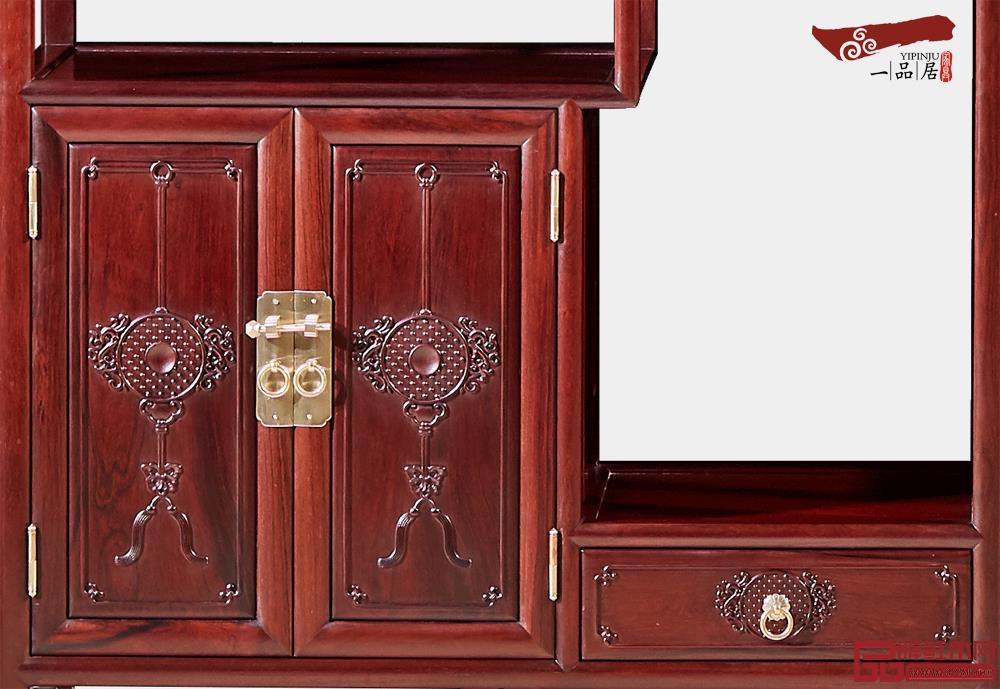 一品居《四抽兩門如意博古架》,精選上等巴里黃檀制作而成。其色澤光潔,木質(zhì)細(xì)膩堅硬。