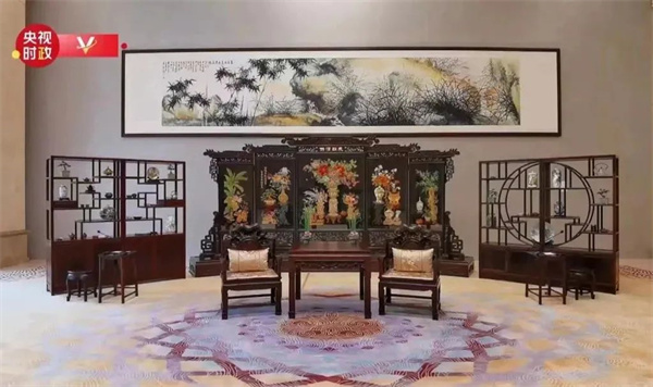 比如:2017年,美國總統(tǒng)來華進(jìn)行國事訪問時,兩國領(lǐng)導(dǎo)人會晤時所坐的“扇面南官帽椅”就成為當(dāng)時的焦點(diǎn),那正是故宮博物院的鎮(zhèn)館之寶;2018年朝鮮領(lǐng)導(dǎo)人來訪、2019年法國元首來訪也都無一例外的采用了紅木家具;而此次也大量采用了紅木家具,太師椅、博古架、屏風(fēng)等,充分展示了大國風(fēng)范,更顯端嚴(yán)莊重,典雅大氣。