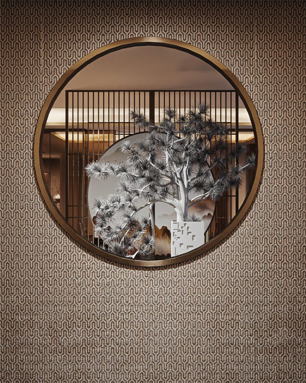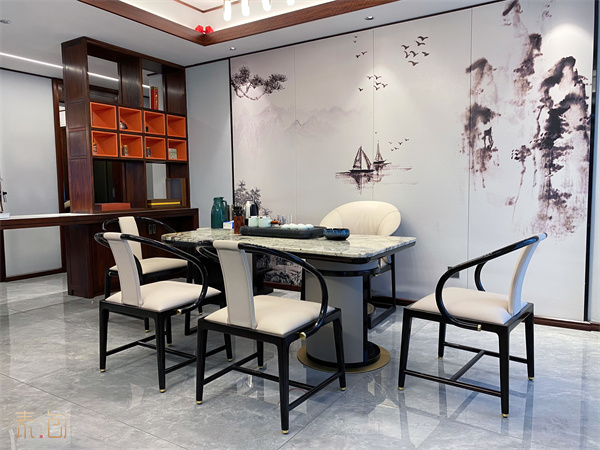 茶室則以水墨畫為背景,一筆一落間,疏密、濃淡,成就“潮平兩岸闊,風(fēng)正一帆懸”的平和之境,與素雅清凈的茶室相互呼應(yīng),也凸顯了主人高尚雅致的生活情趣。