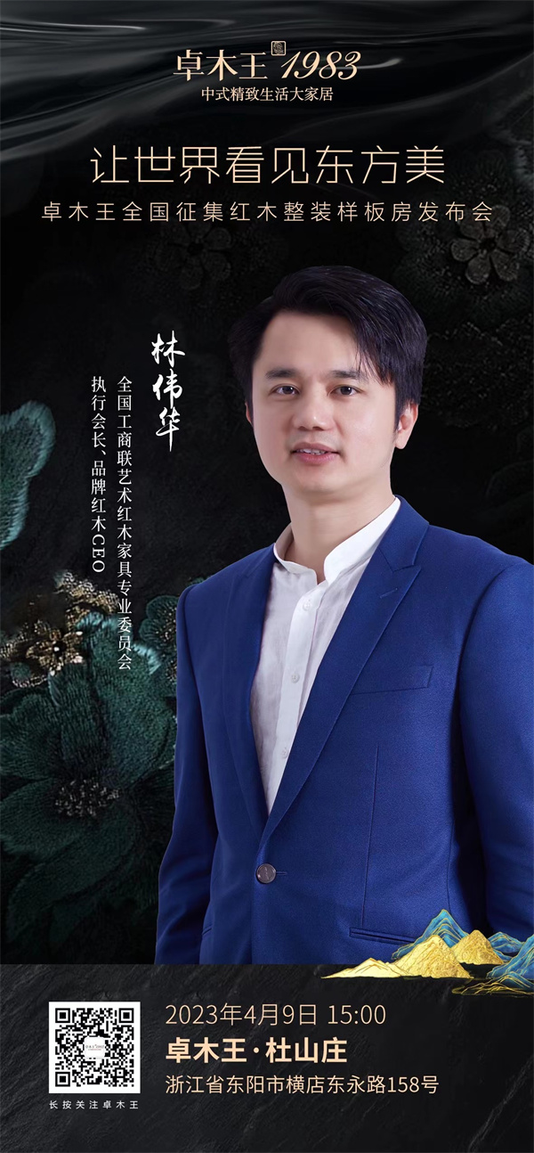 4月9日,“讓世界看見東方美---卓木王全國征集紅木整裝樣板房發(fā)布會”于浙江東陽圓滿舉行,現(xiàn)場多位家居行業(yè)大咖、美學(xué)專家、頂級設(shè)計師共同見證卓木王這一榮耀時刻。