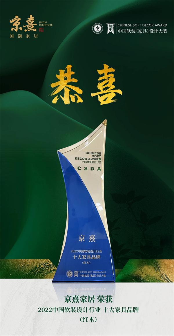 京熹國(guó)潮家居在第七屆中國(guó)軟裝設(shè)計(jì)大獎(jiǎng)(龍承獎(jiǎng))頒獎(jiǎng)盛典中榮獲“2022中國(guó)軟裝設(shè)計(jì)行業(yè)十大家具品牌(紅木)”!作為當(dāng)代國(guó)潮紅木品牌,京熹國(guó)潮家居一直致力于“傳承故宮美學(xué),引領(lǐng)國(guó)潮風(fēng)范”。此次榮獲大獎(jiǎng),是過(guò)去一年行業(yè)的認(rèn)可以及消費(fèi)者的喜愛(ài)。