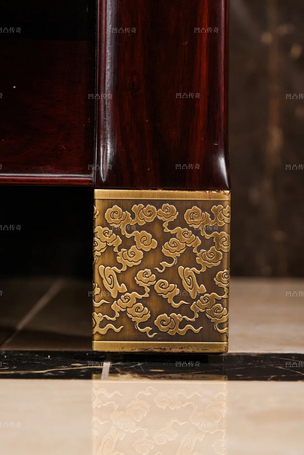 紅木家具上的銅件主要有吊牌、面葉、合頁、套腳、包角、牛鼻環(huán)等,巧妙運用在家具的各個位置,如常見的柜門銅配飾、抽屜的拉手,以及腿部精致的包邊等。