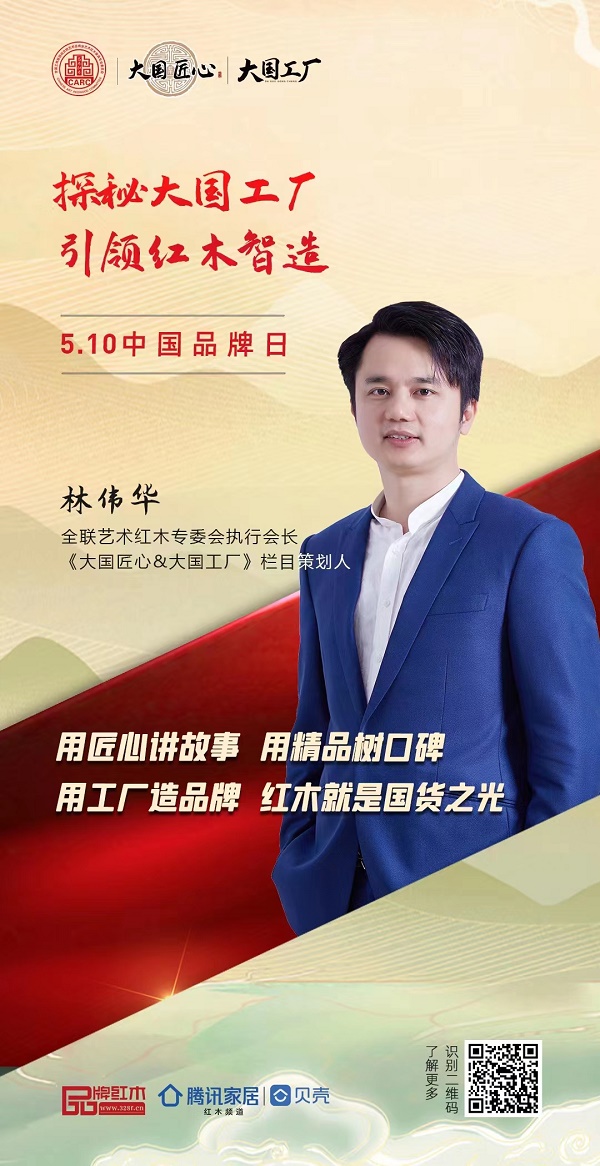 正值5.10中國品牌日之際,品牌紅木&騰訊家居|貝殼,與全聯(lián)民間文物藝術(shù)品商會藝術(shù)紅木家具專業(yè)委員會共同策劃打造《大國工廠》欄目,致敬中國品牌日。同時,攜手品牌大咖向廣大業(yè)界人士,發(fā)起行業(yè)寄語活動,挖掘紅木企業(yè)大國智造力量,點亮紅木行業(yè)國貨之光。
