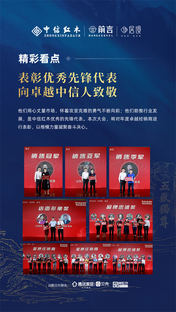 每一份中信紅木獲得的榮譽(yù),都離不開每一個奮斗的中信人。在本次經(jīng)銷商大會上,將延續(xù)往年傳統(tǒng)項(xiàng)目,進(jìn)行年度優(yōu)秀經(jīng)銷商表彰盛典,將以楷模和榜樣的力量凝聚奮斗向前的決心。