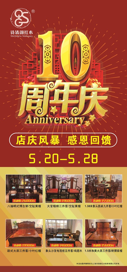 在詩(shī)清閣紅木走過(guò)第十年之際,于5月20日—28日,詩(shī)清閣紅木隆重推出“店慶風(fēng)暴 感恩回饋”活動(dòng),對(duì)所有的新老客戶發(fā)出誠(chéng)摯邀請(qǐng),邀請(qǐng)客戶朋友們“回家”,與詩(shī)清閣紅木一起分享喜悅、開(kāi)懷暢敘。