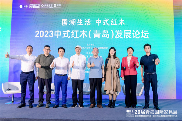 一眾嘉賓為2023中式紅木(青島)發(fā)展論壇點(diǎn)贊,古森紅木董事長(zhǎng)吳飛陽(左一)