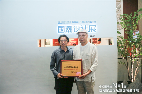 全聯(lián)藝術(shù)紅木家具專業(yè)委員會專家、清華大學(xué)家具設(shè)計(jì)高研班講座教授彭亮(右)與獲得“國潮中式紅木家具精品獎·金獎”榮譽(yù)的拾貳空間·茶事品牌創(chuàng)始人金如箭(左)合影留念
