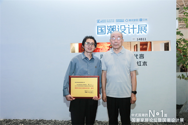 全聯(lián)藝術(shù)紅木家具專業(yè)委員會專家顧問、中國紅木家具技術(shù)專家曹新民(右)與獲得“國潮中式紅木家具精品獎·金獎”榮譽(yù)的拾貳空間·茶事品牌創(chuàng)始人金如箭(左)合影留念