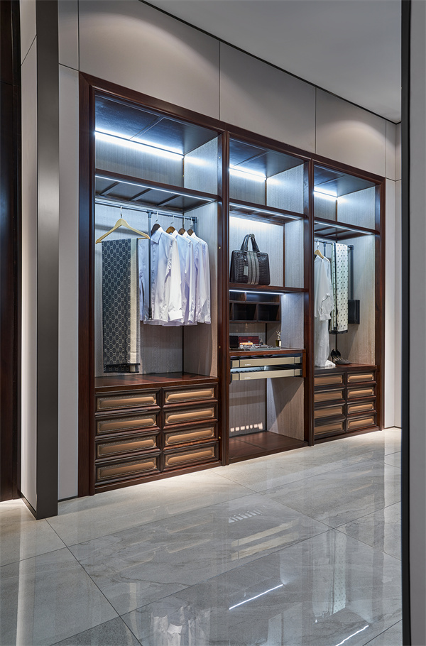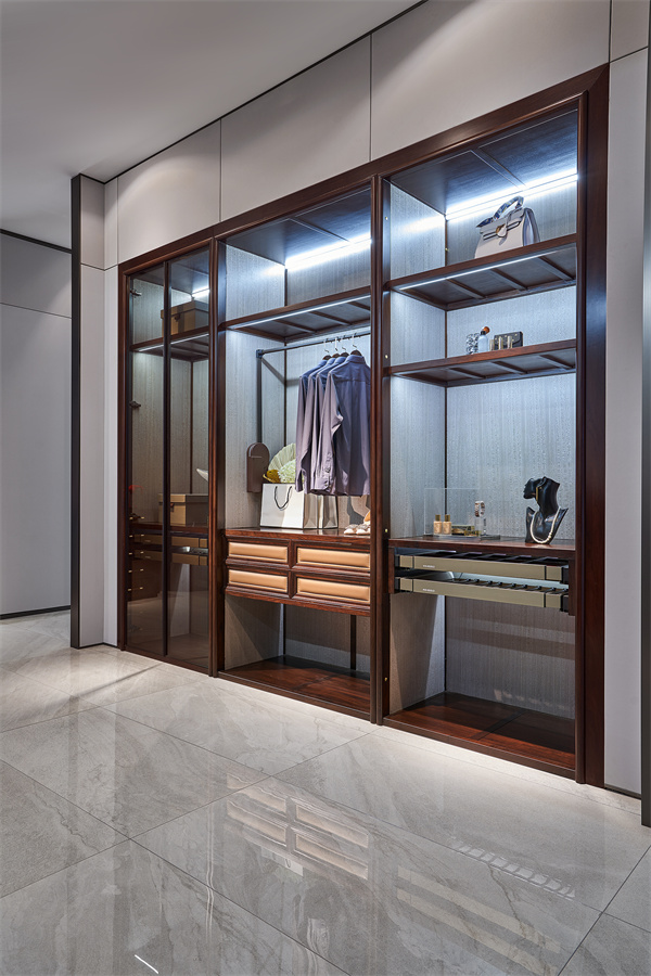 這時(shí)候,有一個(gè)好衣柜是非常重要的。東遇家居·喜氣個(gè)性化衣柜,步入式設(shè)計(jì),儲存空間完整,存取方便快捷。以安哥拉紫檀為主材,面板紋理清晰自然,玻璃門和軟包的融入,使得衣柜呈現(xiàn)出通透空靈的視感,也為空間注入精致的高級范。