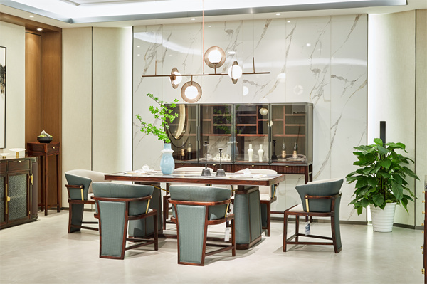 東遇家居設(shè)計(jì)師摒棄繁復(fù)線條和雕刻技藝,造就岳納餐桌潮奢大氣的外觀,大理石渾然天成的肌理,與闊葉黃檀的強(qiáng)強(qiáng)聯(lián)手能消除高溫帶來的浮躁煩悶。象牙白、青綠色的軟裝點(diǎn)綴其中,整體淡雅低調(diào)卻不失輕奢感。