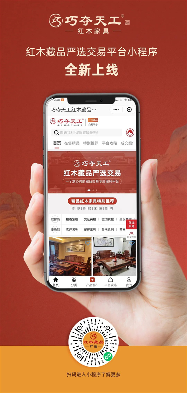 凡是購買巧奪天工紅木家具的客戶,均尊享家具的“二次銷售權”,即可將閑置的家具藏品,放于巧奪天工紅木藏品嚴選交易平臺進行相關展示售賣,延續(xù)更多精品情緣。而這也恰恰是精品紅木家具才能做到的特有價值。