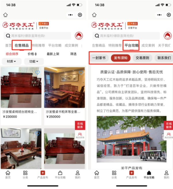 “巧奪天工紅木藏品交易平臺”小程序是一個放心購的藏品交易專屬服務平臺,是為巧奪天工紅木新老客戶提供的高端專屬服務,讓閑置的舊愛實現流轉,擁有“新家”。