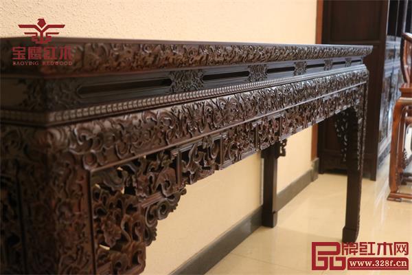 接下來家寶紅木為你介紹一款中西文化藝術(shù)巧妙結(jié)合的《西番蓮條案》。
