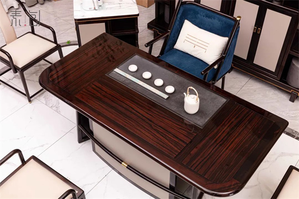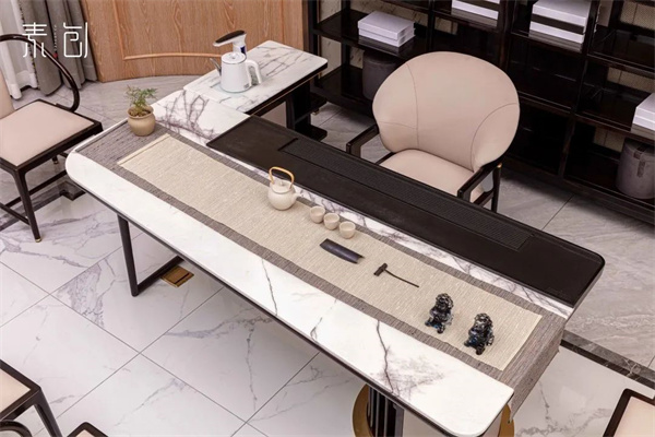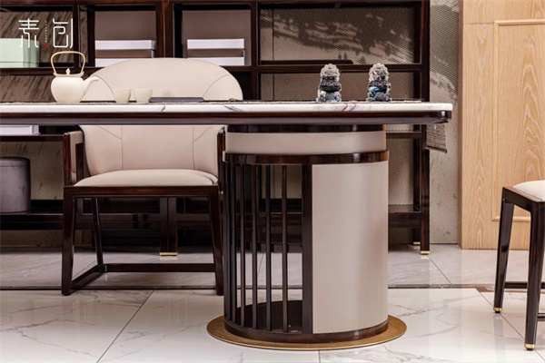 設(shè)計(jì)的巧思是便捷現(xiàn)代人的生活。《素創(chuàng)茶桌》將茶盤與茶桌合二為一,茶桌正面以皮革結(jié)合木質(zhì)框架形成的空間,巧妙遮擋了平常茶桌常見的插座,電線等有礙美觀的物什。舒展簡潔的線條、上舒下斂的造型近似于瓷器盤沿,讓人感觸到清涼之意。