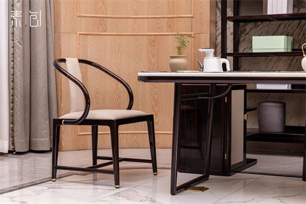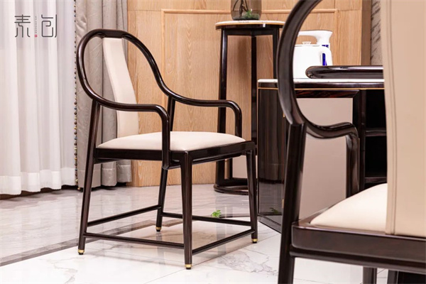 茶椅的巧妙設(shè)計(jì)也能為驅(qū)散夏日帶來的炎熱。椅子摒除雕花設(shè)計(jì),線條流暢光滑;素白皮質(zhì)坐墊自帶絲絲涼意,椅背也大膽以皮質(zhì)軟包作為支撐,長時(shí)間的倚靠也絲毫不會(huì)帶來不適感。