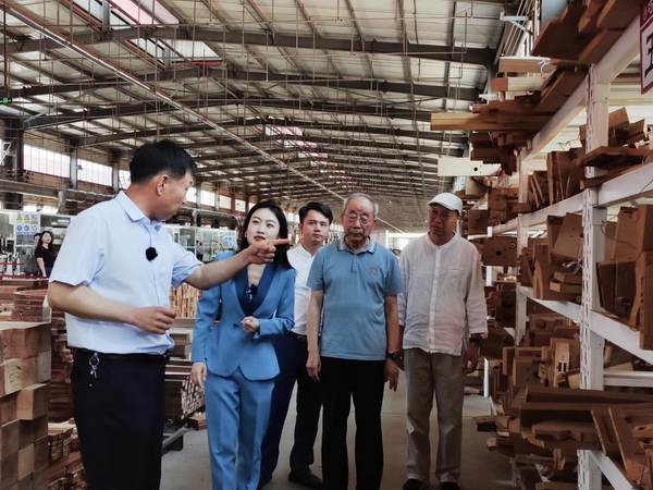 全聯(lián)藝術(shù)紅木家具專業(yè)委員會(huì)專家顧問——中國紅木家具技術(shù)專家曹新民,清華大學(xué)家具設(shè)計(jì)高研班講座教授彭亮,全聯(lián)藝術(shù)紅木家具專業(yè)委員會(huì)執(zhí)行會(huì)長(zhǎng)林偉華,中國傳統(tǒng)工藝大師、巧奪天工紅木董事長(zhǎng)張愛冬,與主持人走進(jìn)巧奪天工紅木工廠