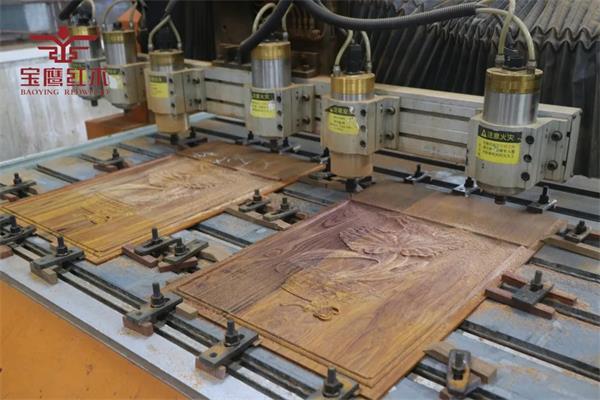首先,精雕車間把花板雕刻好,接下來送到雕花車間進(jìn)行手工刮花打磨。刮刀去除雕刻時殘留的痕跡,這決定了雕刻圖案是否生動形象,線條是否細(xì)膩。利用不同的刮刀在家具表面順紋刮磨,去除刀痕。
