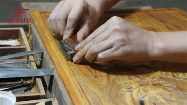 刮花,在紅木家具的制作流程中,起承上啟下的作用。承雕花之后,將家具上的毛刺、凹凸不平的地方刮至平整;繼精磨之前,唯有刮花到位,再經(jīng)過多重砂紙打磨后,才能將紅木家具華麗細(xì)膩的木紋,絲滑溫潤木質(zhì)之美呈現(xiàn)。