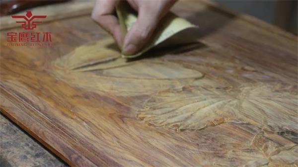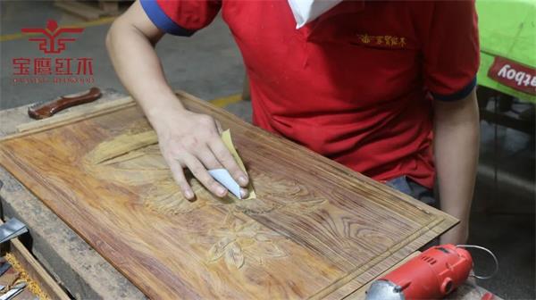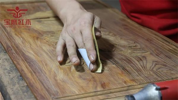 打磨也有兩大步,先粗磨再細(xì)磨。根據(jù)紅木質(zhì)地,依次選擇不同型號的砂紙進(jìn)行打磨。