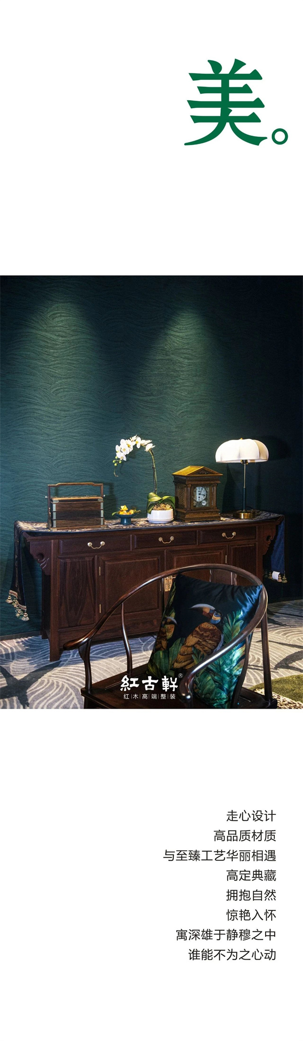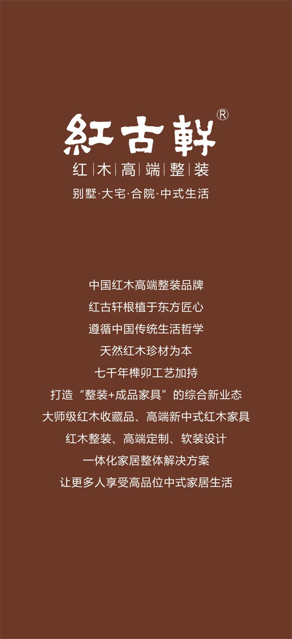 紅古軒紅木高端整裝,為高端別墅、大宅、合院、古建、酒店、會所,提供高品質(zhì)紅木家具、紅木整裝、高端定制及軟裝設(shè)計等一體化服務(wù),讓更多人享受高品位中式家居生活。