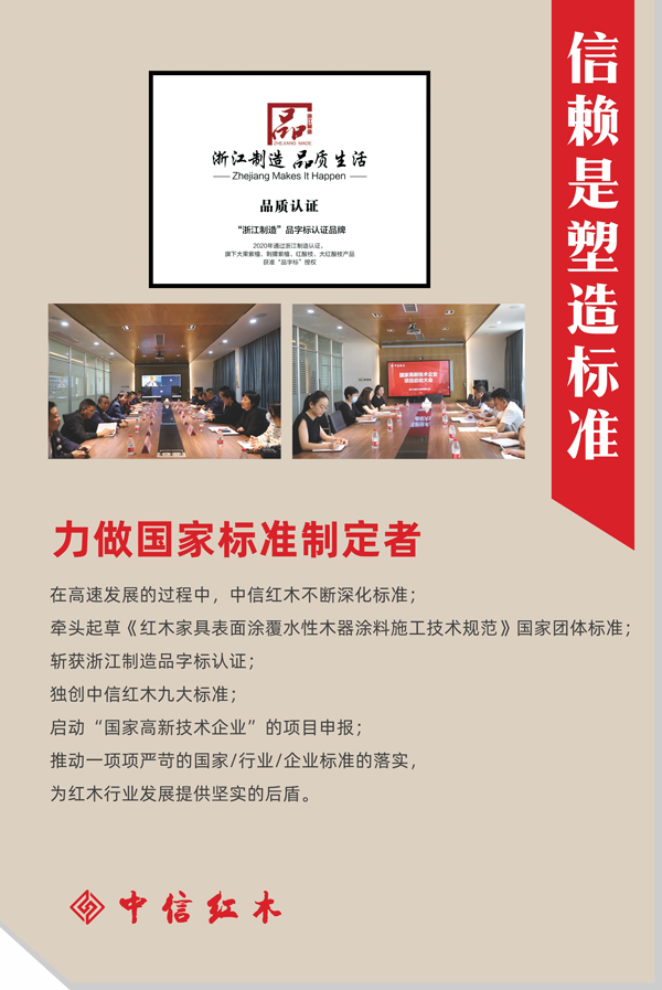 可以看出,獨創(chuàng)九大標(biāo)準(zhǔn)是中信紅木發(fā)展的“生命線”,啟動國家高新技術(shù)企業(yè)項目申報是中信紅木深化建設(shè)的“源頭水”,而《紅木家具水性涂料涂飾技術(shù)要求》團(tuán)體標(biāo)準(zhǔn)正式發(fā)布則是中信紅木落實高質(zhì)量的“先手棋”。
