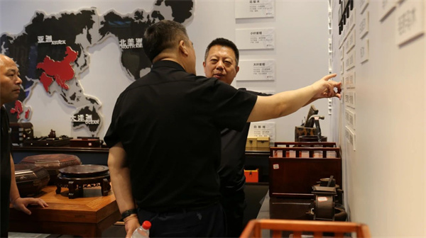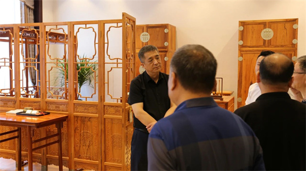 在思想館,不僅陳列著鎮(zhèn)館之寶《基業(yè)永固書房》與榮獲艾琳·國際工藝精品獎的《和天下寶座沙發(fā)》,館內(nèi)更是還原陳設(shè)著G20峰會、廈門金磚峰會、上合青島峰會等現(xiàn)場家具。端莊典雅的器型、細(xì)致入微的紋飾,栩栩如生的工藝,贏得袁良琛處長一行連連贊嘆。