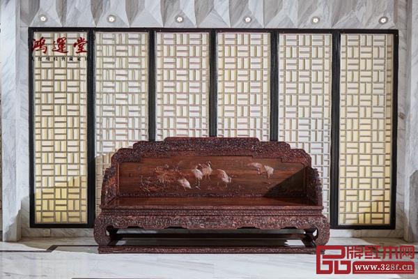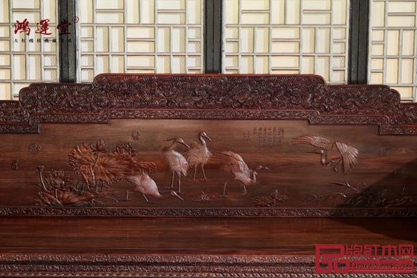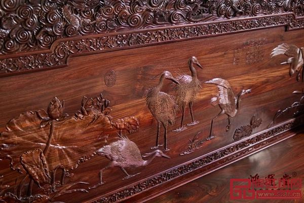 沙發(fā)靠背板上雕刻白鷺荷花圖,將這兩種意象組合到一起,又蘊含家庭和美、路路和順的美好祝福。