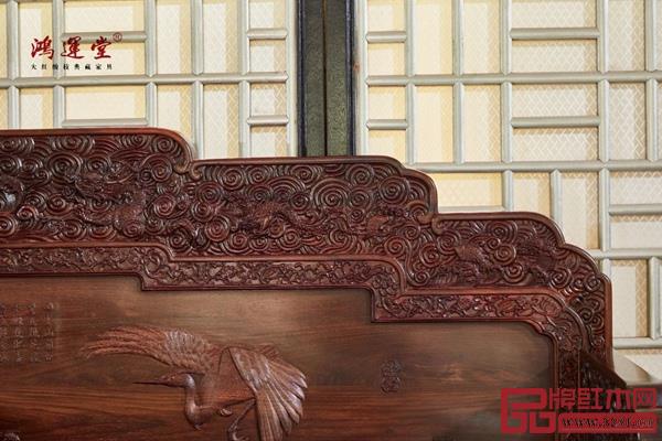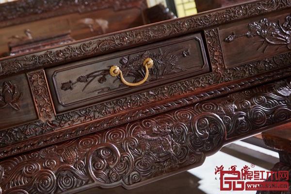 此款沙發(fā)巧用檀雕技法,浮雕荷花、白鷺、祥云、龍紋、花鳥、麒麟等圖案,神態(tài)逼真、線條細(xì)膩,盡顯匠師技藝之精湛。