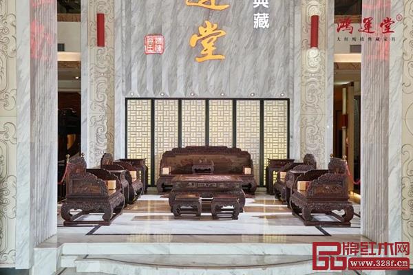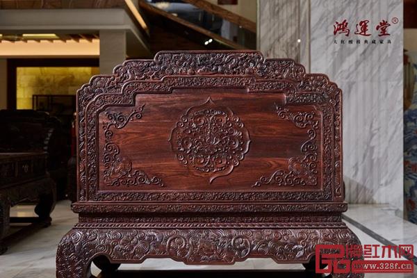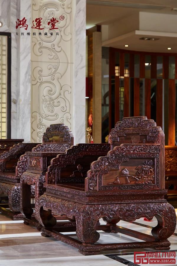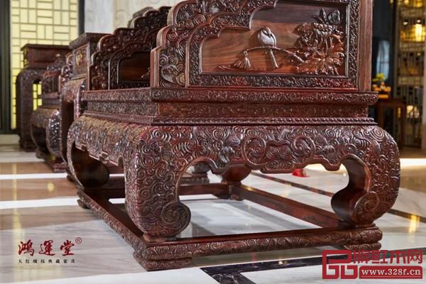 尤為難能可貴的是,如此精細(xì)復(fù)雜的雕刻都是鴻運堂匠人們純手工雕琢出來的。整套沙發(fā)都是雙面雕花,刀工圓潤舒放,回旋起落雄奇,氣韻貫通、渾然一體、栩栩如生。