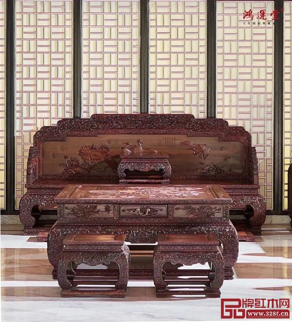 鴻運堂《荷花寶座沙發(fā)》造型恢弘有氣勢、器型方正端莊,尊崇傳統(tǒng)榫卯結(jié)構(gòu),手工雕刻栩栩如生,是不可多得的收藏、實用之佳品。