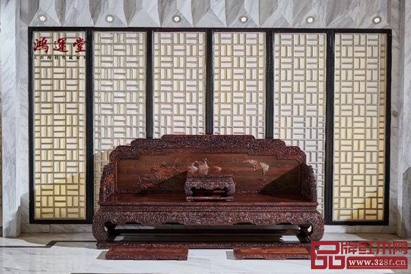 沙發(fā)座椅為三屏式座圍,中高旁低,逐漸降低,線條流暢。制作工藝考究,是傳統(tǒng)國畫藝術(shù)、雕刻藝術(shù)與家具制作技藝巧妙的融合。
