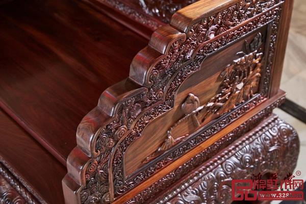 此款沙發(fā)以皇室專用的寶座演變而來,既有中國傳統(tǒng)家具的間架結(jié)構(gòu),又有著宮廷御用家具的沉穩(wěn)與磅礴,以豐富的雕飾彰顯使用者的尊貴,體現(xiàn)了主人的地位與生活品質(zhì),是不可多得的精品傳世紅木家具。