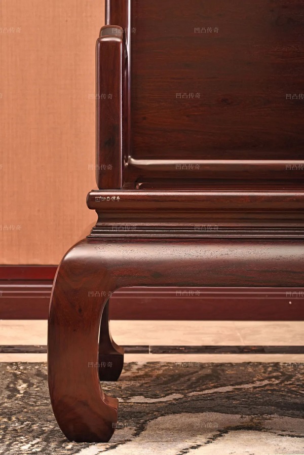 座椅的弧形搭腦和扶手,全部采用整料鏤成,保持了木材的天然紋理,形成了流暢動(dòng)人的曲線,也保證了家具的牢固程度,于細(xì)節(jié)處體現(xiàn)精藝匠心。
