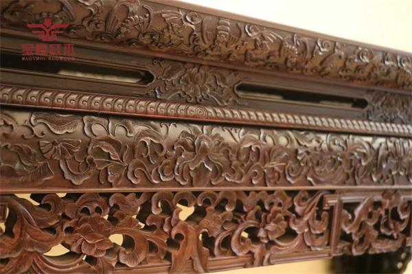 家寶紅木家具上所雕刻的圖案紋飾,歷經(jīng)幾百年傳承,都已形成了固定的樣式,包括植物、山水、故事等,反映了人們對祥和、幸福生活的向往。